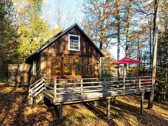 This timber frame cabin and field home site on 83.5 acres of meadow and forest land in Westminster West, Vermont is a peaceful location for weekends, summer residency, or possible year round living. The two-acre field site for a home is north-facing, with no roads or buildings in view, and with a fine view of Mt. Ascutney. A gravel, grassy driveway leads to the top of the field, the potential future house site with a drilled well and a state permitted septic system design. A woodland trail, through a hemlock forest, leads to a stream, and acres of forest to explore. The 16-by-20 foot, one-room cabin sits high on locust posts, is off the grid, has solar panels for electric lights and a fiber optic land line, and has propane service for a stove, lamps, and a refrigerator. A deck made of silver cedar surrounds the cabin on three sides, and seven large insulated windows provide unobstructed views to the forest crown and distant hills. A sleeping loft for a double bed and custom-made, built-in bureaus provide a cozy atmosphere for sleeping. Skylights offer extra light on dark days. A screen house, plus utility and woodsheds round out the cabin area. Heat is provided by a small Jotul wood stove and ample firewood that can be cut on the land. This is truly a “Happy Place”.
