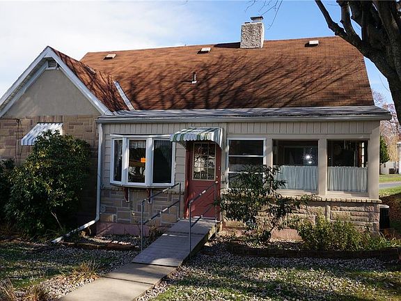 GLORIOUS CITY VIEWS Compliment this STONE Front 4 Bedroom Cape Cod! Lovely Covered Porch Opens into the Living Room with FULL STONE, WOOD BURNING FIREPLACE, Beautiful Laminate wood Flooring, Ceiling Fan and Open Spindled Staircase. UPDATED Eat In Kitchen with SS Cooktop Range, Built-In Microwave, Dishwasher, Double Sinks, Overhead Pendant Lighting. Breakfast Nook has Bay Window and Display Shelving. 1st Floor Laundry Opens to Rear Covered and Open Air Patios! Two Bedrooms and Tiled Full Bath Completes this Level. Upstairs to Find the Additional 2 Bedrooms Featuring CLASSIC CAPE KNOTTY PINE with Cubbies and Built-Ins! Central Air Throughout! ADDED BONUS is the DETACHED TWO CAR GARAGE Complete with Auto Openers and Storage Galore in the WALK UP ATTIC! Seller is Also Providing a ONE YEAR HOME WARRANTY. It All Adds Up to a WISE CHOICE in Today's Market.