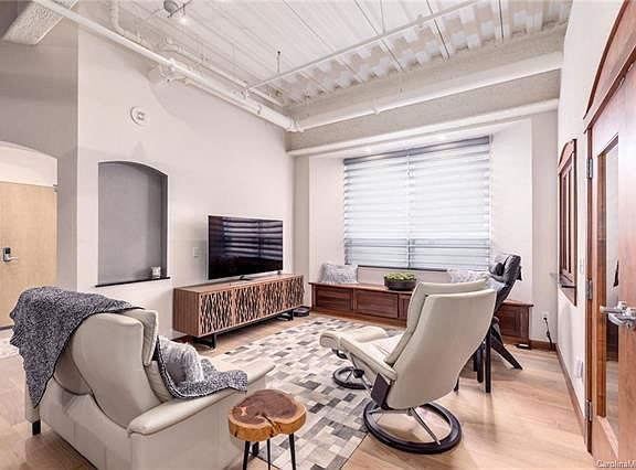 Immerse yourself in the heart of Downtown Asheville in this bright and open condo. Exposed ductwork, 12 ft ceilings and remote-controlled shades make it easy to enjoy the city views. The kitchen features stainless appliances and black granite countertops. The building offers keyless, secure entry, a rooftop terrace and pet-friendly community greenspace. This unit comes with a deeded covered parking space in the secure garage. Close to restaurants, shopping and all that downtown has to offer!