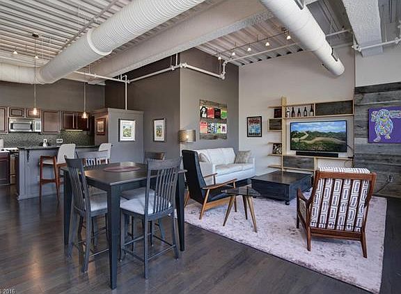 Upscale condo with a modern touch located in the center of downtown Asheville. Walk to everything. This spacious 1 bedroom condo has an open layout with 12ft ceilings, SS opening windows, exposed beams and metal duct work. Fine finishes include stainless kitchen counter top, granite on bar top and bathroom, travertine tile in Jacuzzi tub/shower, and solid birch doors. Office space with built-in desk and shelves off bedroom. Great views from rooftop terrace. Secure parking in building.