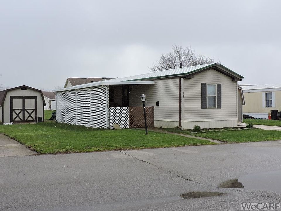 This three-bedroom, one bath home comes with two large sheds. One shed has electric and natural gas heating. New A/C unit installed in 2019, new flooring in living area, and fresh paint in master bedroom and bath. The home and both sheds have a lifetime guaranteed steel roof, installed in 2016. Refrigerator and stove stay. It's a great starter home and is move in ready! The Four Seasons Mobile Home Community requires an application of approval.