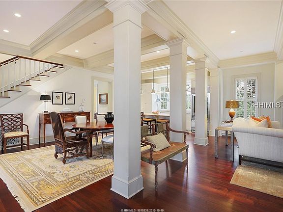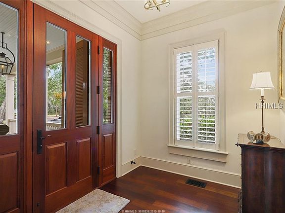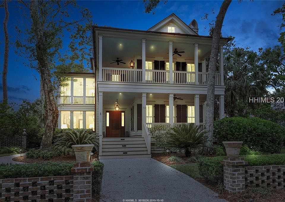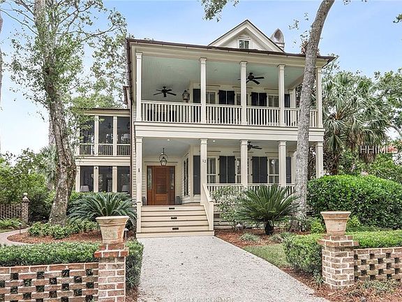 Situated between the May River and the freshwater trail in much-desired South Wilson Village, 12 St. Catherine St. welcomes you to Palmetto Bluff in grand southern style. With its park view, Charleston-style double porch architecture, and a Savannah grey brick wall surrounding the perimeter, this 4 bed/4.5 bath Lowcountry dream home boasts maximum curb appeal. The interior features commercial-grade appliances and plantation shutters throughout, while a detached carriage house with living quarters provides plenty of room for guests. Mature trees, brick sidewalks, and lantern lit streets add to the charm of living in South Wilson.
