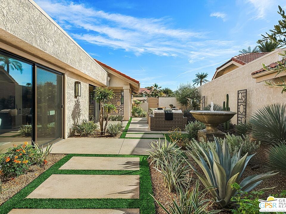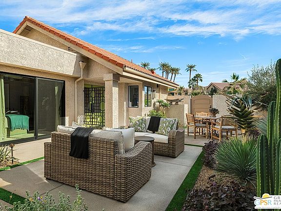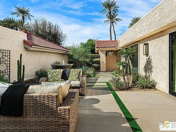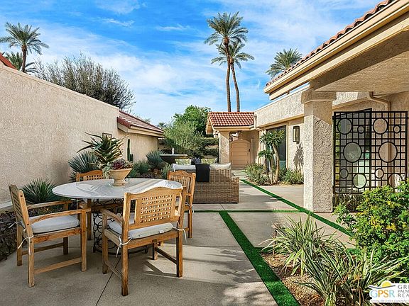 Beautifully remodeled property located in the desirable Silver Sands Racquet Club in Palm Desert. This stunning 2-bedroom, 2-bathroom home has undergone an extensive renovation, showcasing a modern aesthetic and high-quality upgrades throughout. The recently updated kitchen features the premium KitchenAid Cafe' edition appliance package, perfect for culinary enthusiasts. The spacious living area boasts soaring cathedral ceilings and a newly redesigned stone fireplace surround, creating a warm and inviting atmosphere. One of the standout features of this home is the expansive private courtyard, one of the largest in the community. It has been completely transformed with new hardscape, lush landscaping, and custom lighting, seamlessly blending indoor and outdoor living. Additional upgrades include newer flooring, fresh paint, window coverings, and a state-of-the-art heating and air conditioning system. As part of Silver Sands Racquet Club, residents enjoy access to a clubhouse, fitness center, tennis and pickleball courts, as well as multiple pools. The HOA covers building and grounds maintenance, cable TV, Wi-Fi, and trash services, offering convenience and peace of mind. This property is a true gem, combining stylish upgrades with an unbeatable location in a resort-style community.