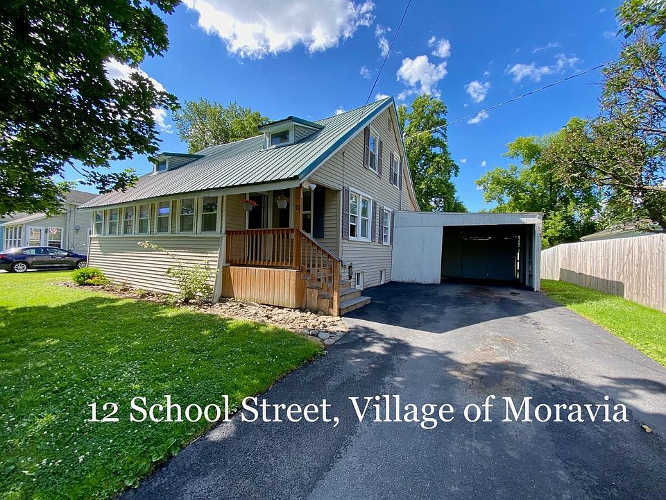 Twilight Open House - Thursday, July 7th from 4:30 - 6 pm! Everyone Welcome! Sweet, simple, affordable. Centrally located in the walkable village of Moravia, water/sewer/gaslines, large fenced yard (mostly), 2 full bathrooms (one up & one down), enclosed front porch, backyard playset, carport for winter, well set up kitchen, 2 bedrooms upstairs, 1 Main Level Bedroom, curb appeal and more. Moravia has stores, restaurants, library, Filmore Glen State Park and more. Easy to get to Ithaca, Cortland & Auburn. Super Easy to see for qualified buyers! Call your Buyer's Agent now!