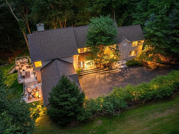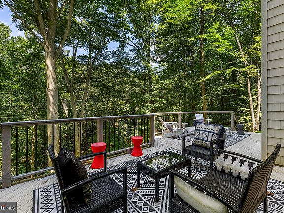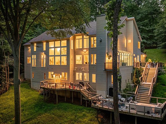 Nestled amongst the mature tree arbor, this custom-built home appears to deliver "traditional" expectations, but your first steps into the foyer reveal an absolutely remarkable and contemporary aesthetic boasting soaring ceilings, walls of glass and a bright, whitewashed interior that exudes freshness, serenity and light! The interior design meticulously establishes open yet warm living spaces that invite occupants to revel in the breathtaking views beyond the walls; to experience the feeling of being perched within the treetops, hovering above the beautiful stream below and being infused with nature. This dramatic design carries seamlessly into the kitchen which exemplifies the marriage of "form and function", the centerpiece of which is a striking Quartz island with waterfall finish and features sleek custom floor-to-ceiling cabinetry. The versatile main level floor plan offers spaces that will suit a multitude of lifestyle needs: an in-home library or study, den or studio, music room...whatever your preferences may be. The Primary Suite is simply remarkable with two exposures of windows that overlook the canopy and boasts a fireplace, sitting nook, a 15' x 14' dressing room with custom wardrobe and luxury bath. Three additional bedrooms, each with their own designated baths, occupy the opposite end of the upper level catwalk. The lower level, 100% on grade, offers abundant entertainment spaces as well as 5th bedroom with a recreation room, hobby/ craft room and an exceedingly impressive home theater that accommodates 16 movie goers plus the adjacent kitchenette for access to all the movie concessions you could need. This home's interior is as much a Work of Art as the stunning pieces that grace the walls of this striking architectural masterpiece! Allow "Coming Home" to mean a return to a peaceful environment, embedded in nature, that gifts the occupants a sense of tranquility.
