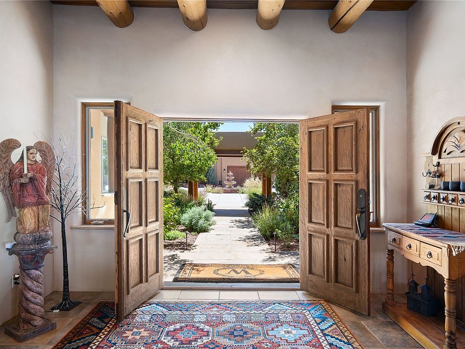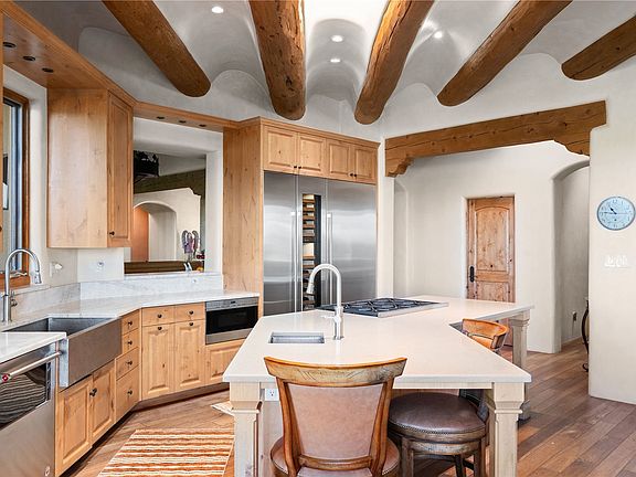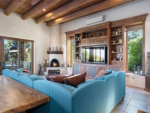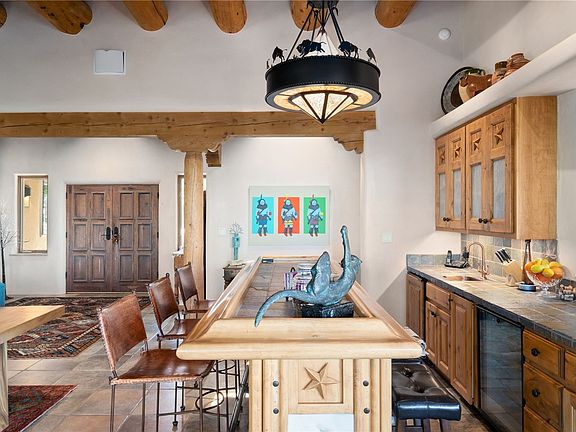 Set high on a private hilltop, and enjoying sunset mountain views, this custom Pueblo Revival compound embodies craftsmanship, substance, and timeless Santa Fe style. Built with quality at every turn and refreshed with a new roof and stucco, the property is introduced by a grand, gated courtyard with center fountain, full poured concrete drive, and a spacious garage for 4 cars. The 3-bedroom main residence, remodeled by Kim Dressel in 2012, reveals artisan details from the moment you step into the dramatic Zaguan entry. Finishes include slate floors, carved woodwork by master craftsman David Naylor, thick plaster walls, and a freestanding bar that anchors the open living and dining spaces. The chef’s island kitchen features Wolf, Sub-Zero, and wine refrigeration, ideal for both daily living and entertaining. The split-bedroom layout offers privacy, while the primary suite is a sanctuary with dual closets, built-ins with fridge, kiva fireplace, and a dedicated exercise room. Outdoor living extends to multiple portals, a rooftop deck with 360° mountain views, a full kitchen, fireplace, and an elegant in-ground cocktail pool. The 3,050 sq. ft. second residence, newly built by Kim Dressel in 2013, echoes the same solid construction and fine finishes. With 2 bedrooms, 2 living rooms, a full kitchen and dining space, carved details by David Naylor, and far-reaching Sangre de Cristo and Jemez views, it offers luxurious comfort. Special features include a built-in bar, 90-inch screen with 9-speaker theater, and an expansive portal with pizza oven, grill, and fireplace. Additional amenities—a workshop, generator, and 15,000 gallon irrigation cistern—enhance function and reliability. Only 15 minutes from The Plaza and Santa Fe Airport, this compound is ideal for multi-generational living or hosting guests in a one-of-a-kind setting where custom design, quality finishes, and Pueblo Revival authenticity define the experience. A contiguous 1.7-acre lot on Black Mesa may be available separately. Membership to the Club at Las Campanas is available for purchase and upon approval.