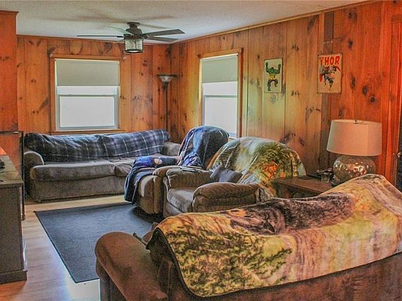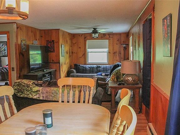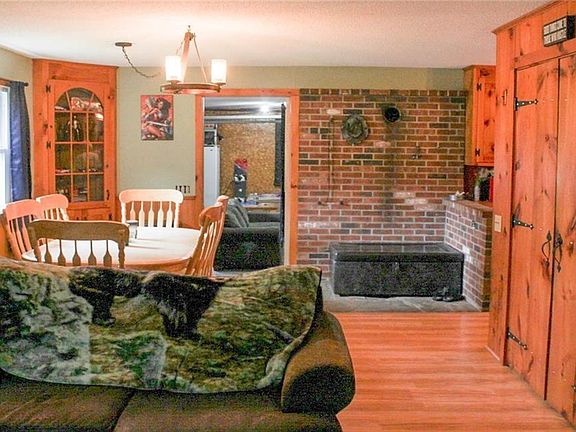 Rustic Ranch home on a beautiful 5-acre property among farms, forests and old stone walls of Foster. Set in a wooded area abutting conservation property. Comfortable one level house featuring an open layout. Living area includes Kitchen, Dining Area, Living Room and boasts a brick hearth for a wood stove. Kitchen offers plenty of counter space and vintage wood cabinets. 1 bedroom with space for more. Full bath, big storage closet. Large partially finished attached garage makes a great playroom, workshop with 200amp service or space for more bedrooms. Full unfinished basement provides expansive storage plus more space for bedrooms. Included is an incredible, exceptionally well-built 2880 sq. foot garage on quality foundation with floor, 20'+ ceiling with exposed rafters, recently replaced steel siding, 2 bay doors, one with an automatic door, recently installed. The building is large enough to hold several vehicles, boats, heavy equipment, etc; excellent rental potential or location for a shop or business. Adjacent is a parking area that can accommodate almost any RV or boat. Near entrance to property is another barn at 207 sq. ft. Plenty of space for gardens, outdoor fun and family gatherings. The ideal setting for a peaceful homestead among the pines!