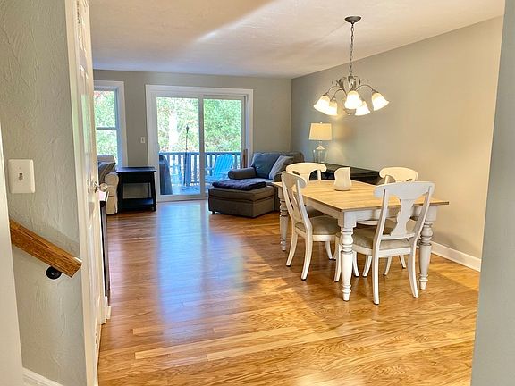 Southpoint Condominiums- sited in a private wooded setting, this complex is near golf, tennis, pickleball, conservation and shopping. All the exterior maintenance has been completed, newer roof, siding, windows roadways. Interior upgrades in 2020 include new hardwood floors, oven, freshly painted and new interior doors. The first floor features a large entry, half bath, closets, galley kitchen that opens to a dining & living room that features a gas fireplace and slider to a private deck. Upstairs has 2 spacious bedrooms and a full bath. The lower level walkout offers generous living / storage space and natural light. There is an association outdoor pool, town water, deeded access to Triangle Pond. Pets are allowed with some restrictions.