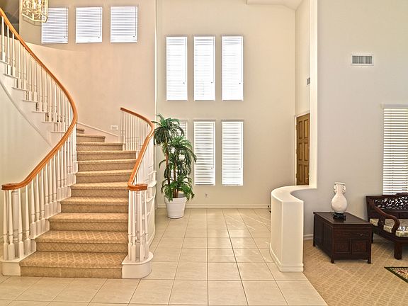 Magnificent Cristal plan 2 model. 5 bedrooms, 4.5 bathrooms. Main floor bedroom with full bath. New thick padding barber carpet and new interior paint for whole house. A dramatic entrance with winding stairs leading to upstairs bedrooms. Formal living room with 25ft vaulted ceiling, oversized windows, custom fireplace and separate formal dining room. Cozy family room adjacent to kitchen has fireplace and newly installed wind shields. Gourmet kitchen with a large granite countertop island, white and upgraded glass cabinetry, new range hood , microwave, and spacious nook area. Romantic master suite with tranquil retreat, fireplace, newly installed drapery, walk-in closet, large soaking tub, separate shower and dual vanities. Convenient inside laundry with basin and storage cabinets. Professionally designed low maintenance backyard with huge patio and water-saving lush plants. 3-car tandem direct access garage with motor court long driveway and new installed garage storage cabinets. Great location - not backing to any busy street and close to Hick Canyon Hiking trail. Recreational facilities include: gated pool, multiple parks, playground and tennis courts. Located at 24-hour guard gated community. Close to award winning schools and shopping center.