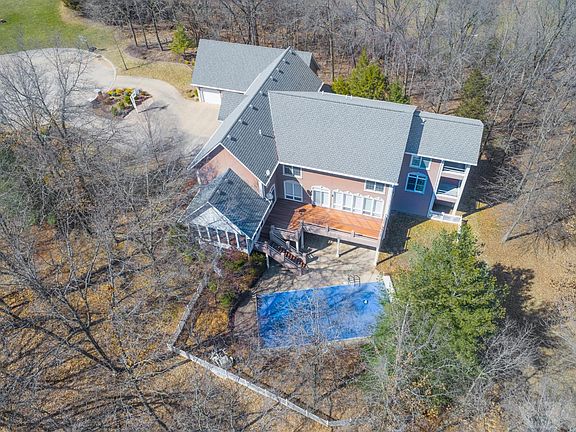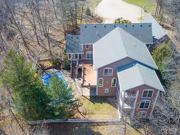 Outstanding 5 bedroom, 6 baths contemporary 2 story home, 2 X 6 construction. 1st floor guest suite, 1st floor laundry. Master suite up plus 4+ more bedrooms. Full basement has 3/4 bath and walks out to in-ground salt water pool. Locked wine room, lots of privacy, 4.4 wooded acres and yet in town. Security System. A MUST SEE!