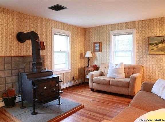 Charming Farm House on a lovely country road steps away from Westwind Orchard and Arrowood Brewery. The farmhouse features a simple and practical layout of a living room w/ wood burning stove, dining room, powder room and kitchen with new appliances on the first floor and 3 bedrooms and a full bath on the second. Attic for additional storage. The large red barn has been renovated as a recreation space with multiple rooms and includes a wood burning stove, electric throughout and great lighting and ceiling fans. Four additional out buildings could be used as great children spaces/playhouse, woodworking or storage. Enjoy the sounds year round of the stream at the end of the property as well as the fire pit in the backyard for summer nights. Sit on your front porch and enjoy the your 3 acre meadow across the street. Landscape comes to life every spring. Japanese Maple in front, grape vines, blueberries, apple trees and walnut trees on property. Please remove shoes and wear booties provided at front door. Thank you.