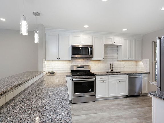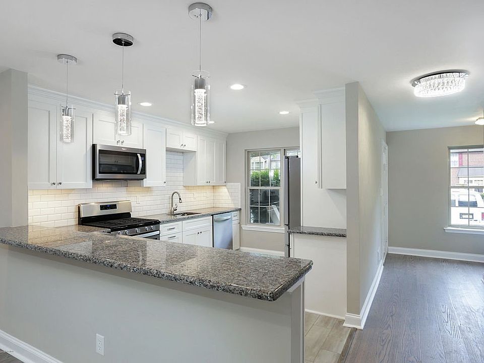 Stunningly renovated & freshly painted townhome w/ open floor plan! Over $50,000 invested -open kitchen to the main living area. White & bright Gourmet Kitchen w/ all new Whirlpool ss app, custom granite countertop workspace, granite dining counter, all-new cabinets, soft-close drawers, sleek subway tile backsplash. New wood flooring throughout first level & all-new recessed lighting.Living/Dining area features a redesigned fireplace with marble/stone accent wall, granite hearth to match the kitchen, and is pre-wired with cable to allow mounting of a flat-screen TV First floor sliders open to a private outdoor patio that backs onto greenspace, New half bath and laundry room also on the first floor. Retreat upstairs to 3 large bedrooms /2 full baths. Please click on more for more details.