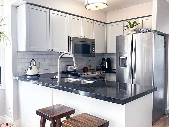 Modern Kitchen: Quartz countertops & stainless-steel appliances (fridge, stove, dishwasher, microwave)