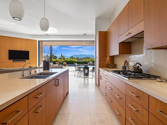 STERLING ESTATES, 12 Summer Sky is a location where the mountain views are coveted. This home has been re-designed in 2019 by Foxx/Curci Construction with a present day, contemporary, custom and minimalist interior. The outdoor, covered patio is an extension of interior living space when the pocket sliders are fully open. Patio features a pop up TV, fire-ledges, shade screens. YOUR sunrise and sunsets are true events and not to be missed at 12 Summer Sky. Fully adequate 3BR PLUS office. The Primary Bedroom is a full wing with a spacious retreat area, dual sliders, built in custom wood framed bed headboard. Travertine flooring thru-out. Pocket sliders in great room and living rm. The Fireplace location is the central statement of the home flanked by the entertainment center and visible from all main liv areas of the house. Additionally featuring: SOLAR owned, Step down bar, whole house lighting, custom cabinetry, Built in BBQ, sheer descents at pool, putting green, MASSIVE MOUNTAIN RANGE VIEWS. Surrounded by Golf options: Mission Hills Country Club across the street, Tamarisk Country Club, Morningside, The Springs.