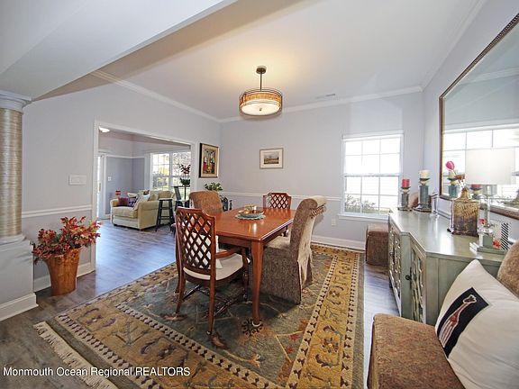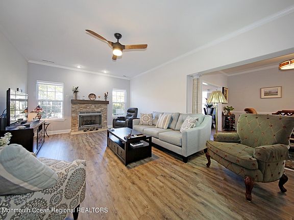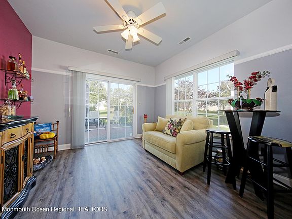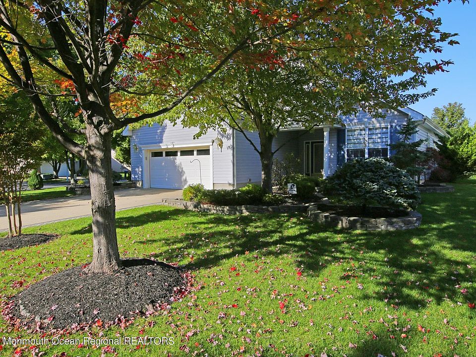 The Villas at Jumping Brook, one of Monmouth County's best kept secrets in adult community living. Expanded Baltusrol model is situated on premium corner lot. Spacious foyer, large inviting living room with gas fireplace, sunny bright newer kitchen with white cabinets, granite counters, tile backsplash and breakfast nook. Dining Room leads to cozy den with sliders to large paver patio. 2 bedrooms; master with tray ceiling and large walk in closet, 2 baths, 2 car garage with room for storage. Community amenities include Clubhouse w/library, card, craft, exercise and billiard rooms. Heated inground pool, tennis and bocce courts. Adjacent to Jumping Borok Country Club, convenient to hwys, shopping, and transit. Minutes to some of Jersey shore's best beaches.