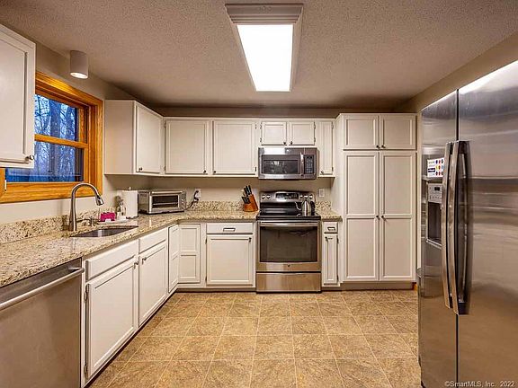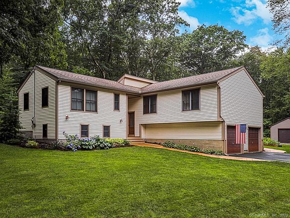 Picture yourself in this beautiful three bedroom, two and a half bath contemporary raised ranch with a home office located in the Northeast section of Ellington. Open floor plan with the living and dining areas offering 14' high ceilings. The sliding door off the dining room leads to a deck with stairs leading down to a ground level patio. The master bedroom has its own ensuite bathroom and a spacious walk-in closet. The downstairs includes a 544 sq. ft. family room with wood burning fireplace, a laundry room, and an additional 500 sq. ft. unfinished bonus room. Many updates including: granite counters, updated bathroom, freshly painted. This almost 2 acre lot also includes a 18'x26' garage with 60 amp electrical service. This property is well-maintained and ready for new owners. Welcome home
