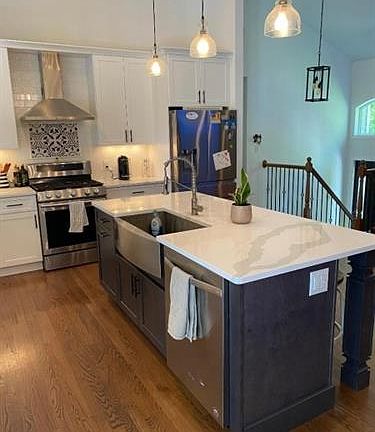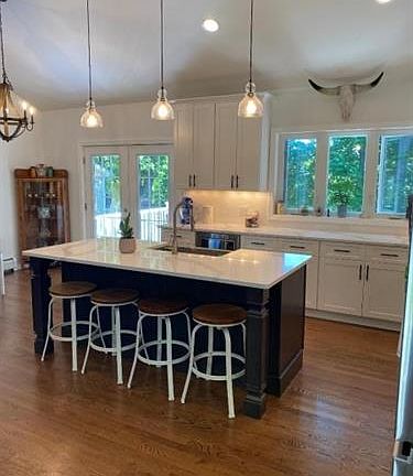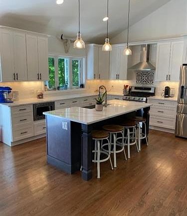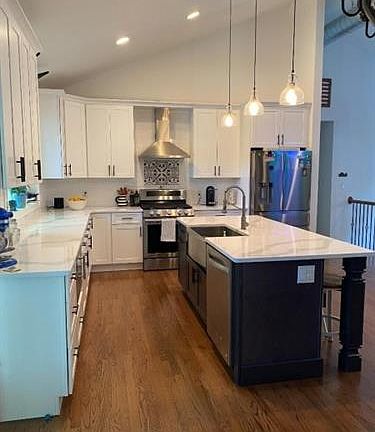 Move right into this beautifully updated Bi Level in the desirable Indian Lake section of Denville. Cathedral ceilings in the open concept LR Kt DR with recently added custom stone gas fireplace, and totally renovated kitchen with stainless steel appliances. Hardwood Flooring throughout 2nd level. The Kitchen has an large center island with Sink that seats 4, tons of cabinet space and Quartz Countertops. From the dining area walk out the french doors to new deck that overlooks fenced in private backyard. There are 3 bedrooms on the second level, the master includes walk-in closet and full bath. Lower level has family room, 4th BR with full Bath, laundry room, and walk out to oversized 2 car garage.