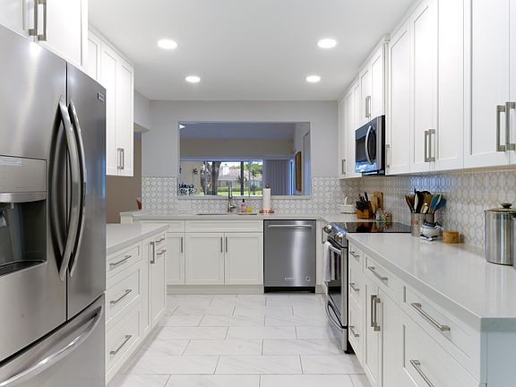 Waterfront pond view townhome in PGA National. Renovated kitchen with gorgeous white cabinets, quartz counter tops and beautiful stainless steel appliances. New flooring throughout. Trek patio deck with covered birdcage, and built-in bookshelves. Epoxy floor in garage. Roof replaced 2015, AC handler replaced 2018, water heater 2018. Giant primary bedroom and large primary walk-in closet. PGA National Resort Membership is NOT required to live in PGA National but social, tennis and golf membership are available for the newly renovated club.