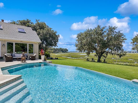 (A Buying Opportunity!) Experience the pinnacle of Lowcountry luxury in this meticulously updated custom home, where breathtaking marsh-to-river views unfold beyond a canopy of grand live oaks. Thoughtfully designed for both refined living and seamless entertaining, the home welcomes you through a private gated garden into a sun-filled interior with soaring 12-foot ceilings and elegant architectural details. At its center is a chef's kitchen featuring a Wolf range, four ovens, Sub-Zero refrigerator, dual dishwashers, wine fridge, and a striking 10-foot island perfect for hosting. The first-floor primary suite is a private retreat with dual walk-in closets, a dedicated laundry room, and tranquil views. Additional features include a spacious bonus room, custom closets and built-ins, two laundry areas, new carpet (2023), updated HVAC (2020), resurfaced and retiled pool (2025) with a premium heat/cool pump (2024), epoxy-coated garage floor, and a brand-new roof (September 2025). Outdoor living is enhanced with UV-protected windows, professional landscaping, and a custom fire pit for evening gatherings. Blending timeless elegance with modern functionality, this exceptional home offers a truly elevated coastal lifestyle.