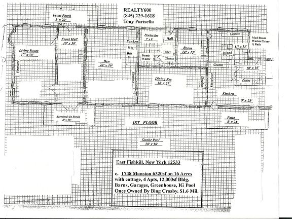 circa 1741 Brick Mansion, marble and wideboard floors, marble fireplaces 30-foot living rm, 30-foot kitchen, 30-foot den, formal dining room, dutch oven radiant heated kitchen floor, cherry cabinets, sunken wet bar, kitchen island, dumb waiter, 7 Fireplaces, etc. Slate Roof, Inground pool, 4 apts, cottage, old barns, older 12,000sf comm.bldg, greenhouse, 4 garages, zoned residential and commercial uses including bed and breakfast, antiques, restaurant, etc, zoned 1 acre residential (maybe 7 lots) once owned by Bing Crosby Family