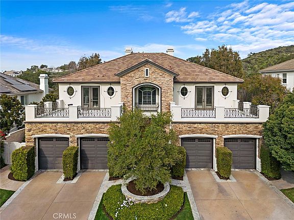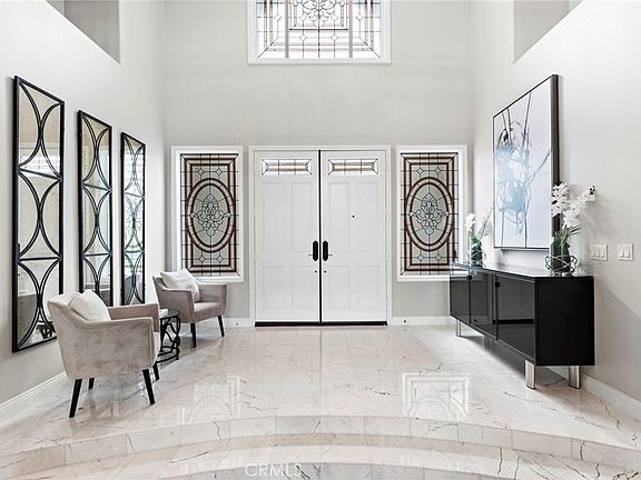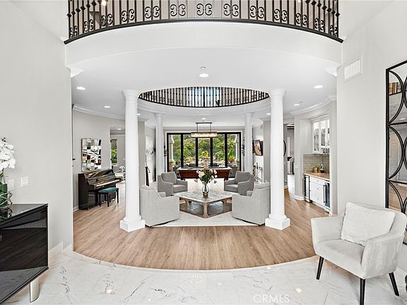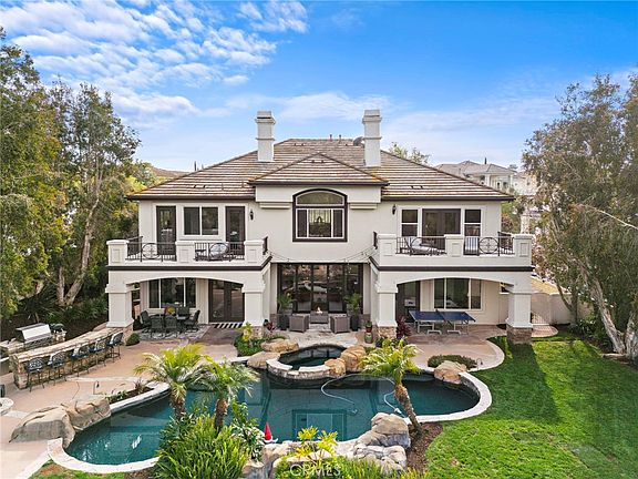 This stunning renovated home in the Grand Coto Estates awaits you. Enter to a grand rotunda with Carrera marble floors, and see the mountains through the La Cantina 5 panel doors, which lead you to a backyard oasis with saltwater pool, spa, mature landscaping, built in bbq, firepit, and views of oak trees and majestic mountains. This home is on a single loaded street, and boasts 6 bedrooms, 4.5 bathrooms, 4 garages and 4 balconies. Main level has a nicely sized bedroom with en suite. There's another main level oversized bedroom, currently being used as a home office, with French doors that lead to the backyard. The great room features a renovated kitchen with center island, walk in pantry, dining area, fireplace with marble surround, living room and two sets of French doors that lead to the backyard and side yard. In the grand rotunda area, there is a built in bar with two beverage coolers, a large laundry room with a sink and upper/lower cabinets for storage, and door to the side yard. A large powder room, and plenty of space for a piano, pool table, or formal dining area, round out the main level. On the second level are two more bedrooms connected by a Jack & Jill full bath. The bonus room was converted into an oversized bedroom with en suite bathroom, walk in shower, walk in closet, and an attached balcony with French doors. The entire upper back side of the house is the primary suite, which includes a retreat area with a fireplace, an elevated bedroom, dual vanities/sinks, walk-in shower with bench seating, a luxurious Jacuzzi whirlpool jetted tub with marble surround, and huge walk in closet with custom built in shelves and racks. There are two additional balconies from French doors in the primary bedroom and bathroom to enjoy the sunsets and snowcapped mountain tops. The well situated lot is over a quarter of an acre, and has two side yards each with double gates. Coto de Caza is a 24-hour guard gated community with numerous amenities including a private equestrian center, hiking, biking and horse trails, numerous parks and a sports park. The members only Golf & Racquet Country Club has two premier 18-hole golf courses, a two-story gym, dining, tennis, pickleball and a junior olympic sized pool. Low HOA dues and low taxes with no mello-roos.