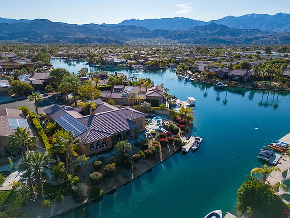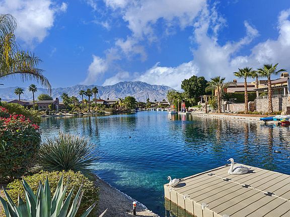 Located on a sprawling corner lot off the nine-acre lake in coveted Santo Tomas, this recently updated residence offers a very unique lifestyle in the desert. Showcasing direct mountain views, a large wrap-around backyard patio, and your own private dock, the current owner also infused a Moroccan style, greeting owner and guests in the charming designed courtyard. Additional notable features: lagoon-style saltwater pool and spa with pebbletec surface and multi-colored lighting; owned solar system; totally remodeled kitchen featuring custom cabinetry, stainless steel appliances, stone countertops, and striking tile backsplash; newer air conditioning units; spacious primary suite with Italian wood flooring and sizable bathroom area; separated casita with high ceilings and plenty of room; cozy guest suite; fire-pit gathering area overlooking the lake, and well-maintained mature landscape throughout exterior. Santo Tomas is a gated community with low monthly HOA dues and Social and Fitness membership to adjacent Mission Hills Country Club.