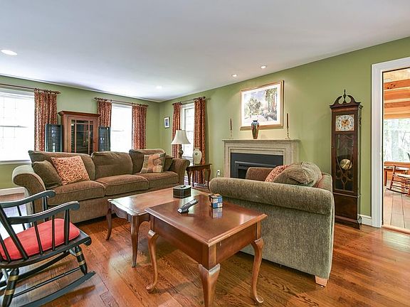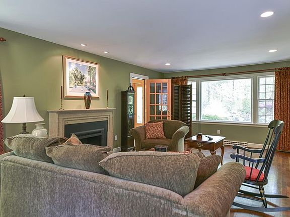 Picture perfect just begins to describe this beautifully updated and pristine 4 bedroom, 2.5 bath center entrance colonial set at end of lovely cul de sac. Living room with cozy gas fireplace and recessed lighting. Renovated kitchen with custom cabinetry, granite and stainless appliances. Open to cathedral family room with gas burning stove, skylights and slider to deck. Dining room off kitchen. Master bedroom with updated private bathroom and 3 more bedrooms and a full bathroom upstairs. Hardwoods throughout. Central air. Magazine beautiful sunroom with cathedral ceiling overlooks gorgeous, private and serene 2 acre lot. Mature plantings and stonework. Just a short walk to library, restaurants, coffee, church and shopping! Updates include: Master bathroom (2013), Sunroom (2010), Converted to gas and new furnace and hot water tank (2008), Deck (2008), Kitchen (2008) and Roof (2006)