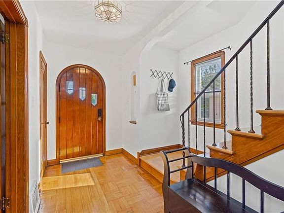 This charming brick home features a large, level yard conveniently located near I79, Southpointe, and Rt19. Charm and character abound with it's arched entry door, hardwood floors, and wood trimmed windows. From the large entryway, French doors open into the living room boasting a decorative fireplace, ceiling fan, and glass block accent windows. Another set of French doors lead to the addition featuring a Den and Powder room. The kitchen offers newer appliances (2019), lots of cabinet space, a bay window, and an eat-in area with booth seating! The dining room offers plenty of space for a large table. All 3 bedrooms feature hardwood floors, ceiling fans, and wood trimmed windows. The large basement offers high ceilings, a shower, and an additional refrigerator and freezer. The detached, 2 car garage has plenty of space for a work area and storage. The large yard boasts a storage shed, swing set, and tree lined landscape. A Guard Home Warranty VIP Package is included with this home!