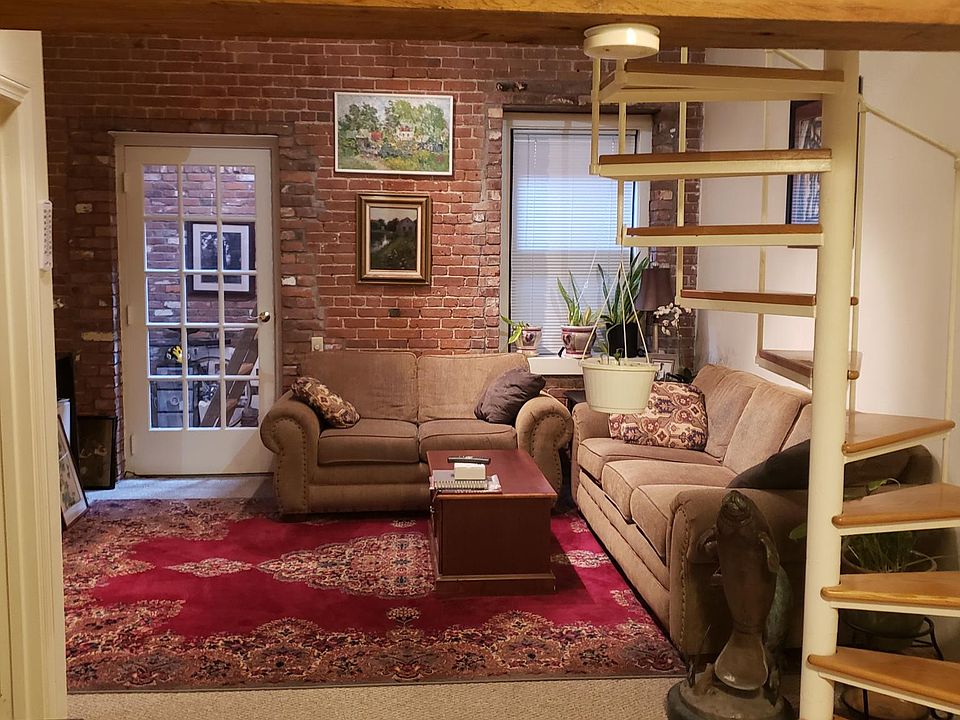 This centrally air conditioned very unique loft-style apartment is located on the first and second floors of Factory Square, a secure, renovated mill building. The apartment is approximately 1300 sf, has loads of exposed brick, some wood beam ceilings and a skylight that provides a warm, cozy feel. The loft-style MBR is on the upper level and the LR/DR, kitchen and two bedrooms are on the lower level. The MBR has its own full bath(with tub and shower) and the other bedrooms share a full bath (shower only), located just outside the bedroom doors. Past residents have typically used the third bedroom (all brick), which includes a loft area, as a bonus room with loft office space, additional storage and or work studio. The kitchen is fully-applianced with a frost-free refrigerator, self-cleaning range, microwave range hood, dishwasher and disposal. The kitchen and bath floors are tiled and the balance of the apartment has wall-to-wall carpeting. Up to two parking spaces are provided for residents on the lease. The on-site laundry is on the second floor, directly accessible from the MBR. Total move-in costs are an application fee of $30.00, the first month's rent and one month's rent as security deposit. We allow pets under 40lbs. but there is an up-front pet charge of $250 plus $50 of additional rent per month per pet. We apologize for this policy but have learned from experience. 1 Year lease term. Equal Oppotunity Housing