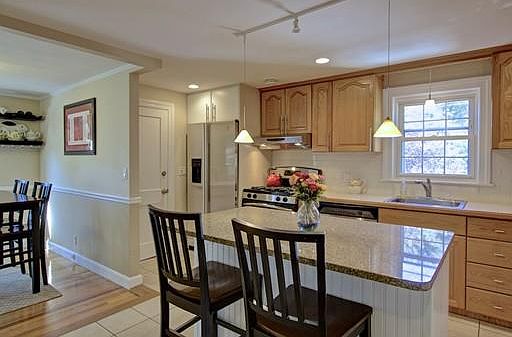 Bright sunny three bedroom condo professionally renovated in 2006 on corner lot. Kitchen features granite island, stainless appliances, and gas cooking. This unit offers spacious open floor plan with hardwood floors. Two bedrooms on second level and 3rd Floor Master Suite features skylights, built-in dresser and cabinetry, master bath, and laundry. EXCLUSIVE use of fenced back yard. Attached two car garage and additional 1 car off-street. Located close to Arlington Center and it's wealth of restaurants, shops, and public transportation.