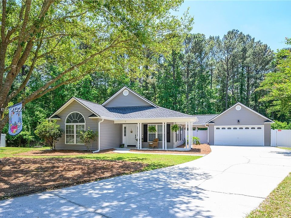 Elegantly updated 3-bed, 2-bath home nestled on a cul-de-sac, just a short stroll or golf cart ride from Woodbridge's picturesque leisure trails & community pool. Enjoy relaxing or hosting in your private, fenced backyard complete with firepit & polywood chairs, spacious enough to accommodate a pool, hot tub, or playground. With Buckwalter's rapid growth, you'll have convenient access to grocery stores, dining, & entertainment. Currently zoned for sought-after K-8 River Ridge Academy & May River High School. Features include 2021 roof, 2022 siding, 7 year-old HVAC with 1.5-year-old ductwork & air purifier, plus a whole-house surge protector.