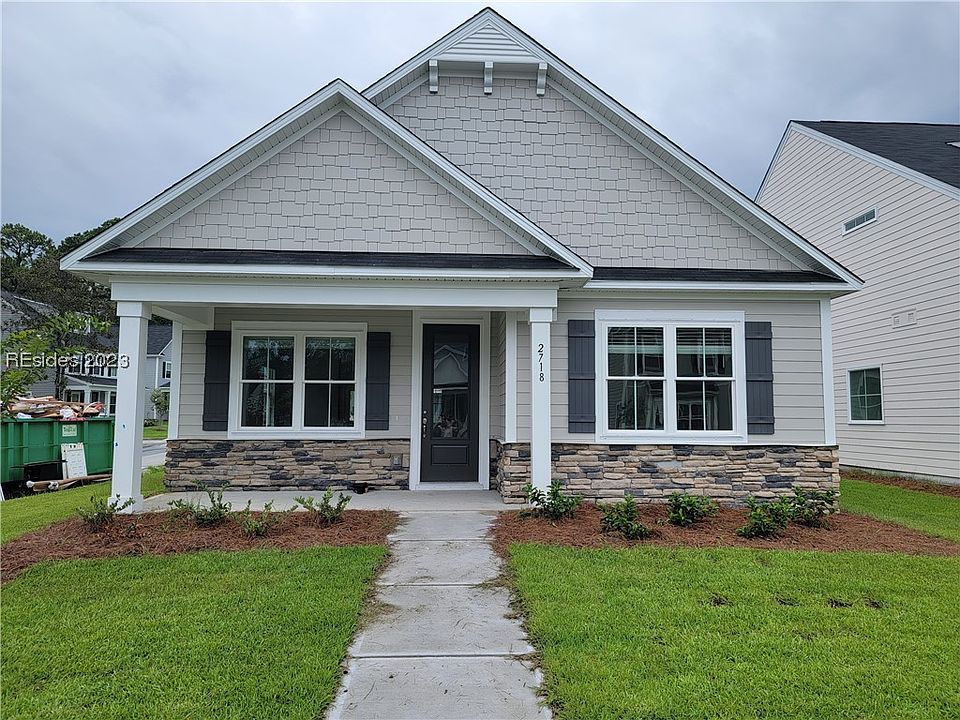 River Oaks offers this single-story plan with 2 car garage. High sloped ceilings make this open plan bright and airy. Lots of counter space and cabinets! The primary suite is tucked in the rear of the home for privacy. Guest bedrms are in the front of the home with a full bath. Includes screened porch. LVP flooring, quartz counters, stone accent, shaker style siding, backsplash and chrome accents. Enjoy the Lowcountry nights on either the front or rear-covered porches! Discover River Oaks, Beaufort County's newest community peppered with century-old oak trees and wildlife. Bluffton schools! Pictures are not subject property but is similar.