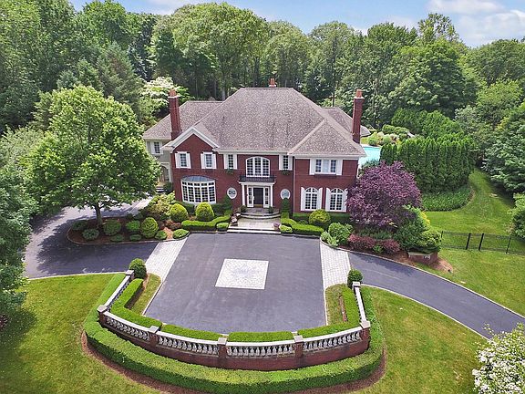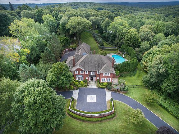 Distinctive 5 BR, 5/2 BA Georgian Colonial on 2 lush acres on cul-de-sac in W. Mtn Estates w/curb appeal & views. Beautiful new HW flooring thru-out & freshly painted. Over 7,200 SF above ground. High end finishes thru-out include 10ft hand-painted ceilings, custom moldings, wainscoting, floor-to-ceiling windows & doors, & 5 fireplaces. Chef's dream kitchen w/coffered ceiling, fireplace, double islands, SS appliances, gas cooktop, double ovens, Subzero refrig, two dishwashers, ice maker, trash compactor, warming drawer, beverage refrigerator & butler's pantry w/Northland freezer. MBS w/jacuzzi, double rain showers, sitting room w/FP, wet bar, stereo system, skylights, & private balcony. Wired for technology w/whole-house generator, Lutron Light system, outdoor 24-hour video security system, video door system, Nortel phone system, lightning strike prevention system, surround sound, indoor/outdoor audio, hard wiring for home theater. Level & private backyard has irrigation system & is enclosed by 8-ft deer fencing. Two spacious bluestone patios & balcony adjoin the custom gunite pool & spa w/colored accent lighting & water slide. Oversized 4-car garage w/workbench, sink, storage system & closet. Foundation, septic & electric panel in place for second dwelling. Unfinished 3,000+ SF basement includes 10 ft ceilings, plumbing for a full BA, space for wine cellar, patio access & fireplace! HOA is active & family-friendly. Close to town, schools, shopping & NY border for commuting.