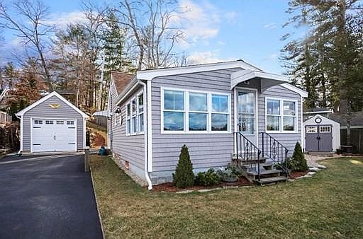 Welcome to Stetson Pond! A beautiful 93-acre, fully recreational pond suitable for boating, fishing, kayaking, swimming & more! This home is nestled on the banks of Stetson Pond with direct water frontage, panoramic views & deep water access. Sunsets galore! There are many outdoor spaces to enjoy the pond and well-manicured landscaping. The home is fully updated and features granite countertops, soft close cabinetry & efficient induction cooking. The layout features an open floor plan and plenty of space for a home office. The roof features newer architectural shingles. Systems and windows with Bali blinds are newer. LED recessed lighting and ProGen Tarkett luxury vinyl flooring throughout. Classic and low maintenance CertainTeed cedar impressions shingles. The home is fully insulated with Rockwool insulation. Plenty of parking options with two paved driveways and a bonus one car detached garage! Newer 2 bedroom septic system. Commuter rail nearby.
