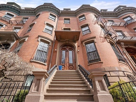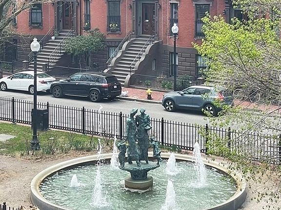New Listing! Enjoy incredible direct views into the gorgeous & epic fountain of Worcester Square! Entire floor through with the major rooms fronting this stately square. Lovely Southwest exposure. Just one flight up above parlor level. Grand soaring ceilings, tall/wide windows, sunny rooms + beautiful wood floors. Sleek open kitchen with centerpiece long stone breakfast bar, Italian designed cabinets & stainless appliances with gas cooking. Additional wine bar located just off the living room/kitchen. 2 king sized bedrooms both generously proportioned with large closets. Immaculate bathroom with marble travertine + inlaid onyx, jetted soaking tub, large custom mirror & five globe light fixture. Central AC. In-unit laundry. Additional custom fitted deep closet. Petit balcony with east light perfect for morning coffee. Live in the middle of the exciting South End neighborhood near destination restaurants, shopping, Whole Foods, SoWa open markets + more all outside your door
