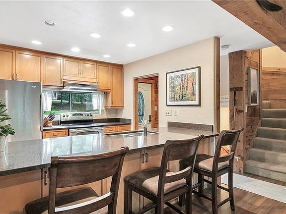 Four Season Picturesque View End Unit oversized Townhouse in the desirable Seven Springs Resort. The kitchen island has back to back cabinets for additional storage, solid surface counter tops, and updated cabinets. Enjoy the open 1st floor dining room area with additional dining at the kitchen island. Three bedrooms on the second floor and two on the lower level. Fourth bedroom can also be a game room. All bedrooms include ceiling fans. Enjoy this 25x15 newer trex deck overlooking the lights of the slopes with rear access. Five bedrooms, 2 full baths, Exterior freshly painted, Access to the outdoor pool and tennis courts. Completely furnished (excludes master bedroom headboard/footboard). Laundry Room includes a stackable washer and dryer. Also the basement has a sauna (but needs reconnected). Just bring the family and move into this great location. Enjoy all the seasons and your coffee on your new deck.