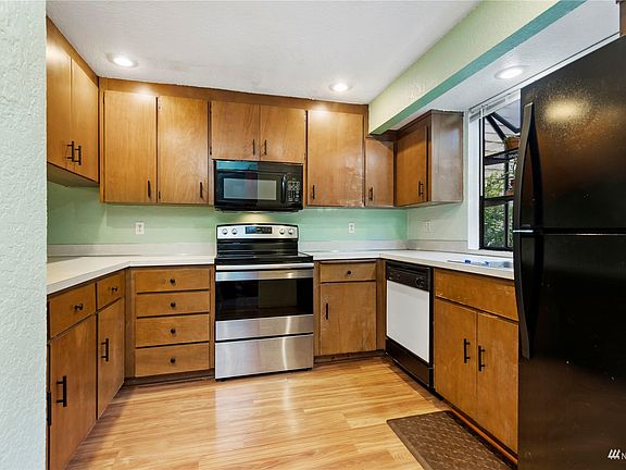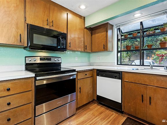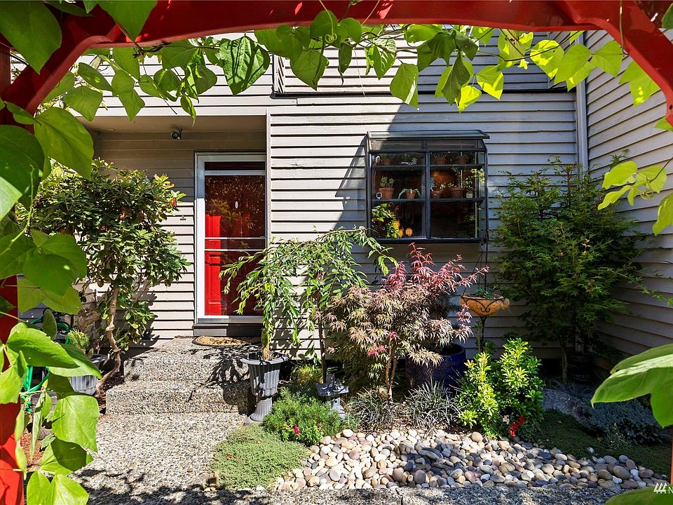 Come see this clean, spacious, well kept townhome! This 1135 sq ft home provides a great open concept layout downstairs, a cozy wood fireplace and pretty views of the secluded woods right outside your balcony. A large kitchen shows off abundant counterspace, a beautiful garden window and appliances that stay. Primary bedroom with balcony, a guest bedroom, full bath and washer/dryer are all conveniently located upstairs. Need storage space? This place has it! Need garden space? It has that too! Close to schools, shopping, Boeing, and freeways. Check it out soon as this one wont last long.