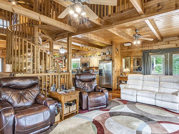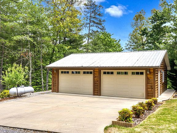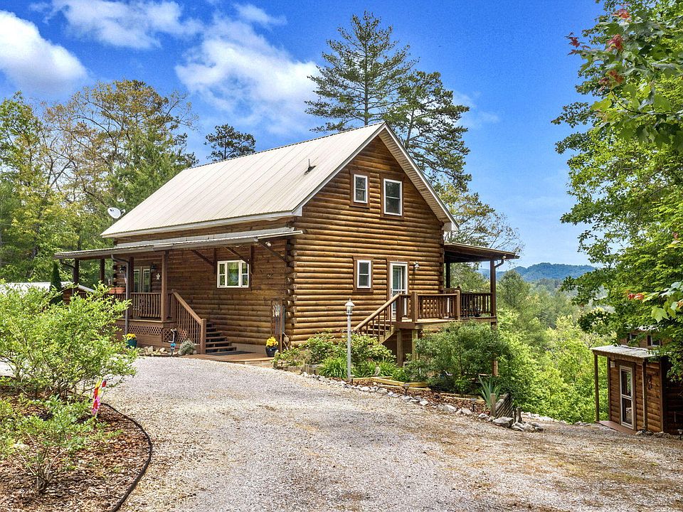 BEAUTIFUL LOG HOME! The large covered front porch leads you into the main level of this beautiful home through the double front door. When you enter, you will find the living room that has pine flooring, a cathedral ceiling, a gas log fireplace, a coat closet, and two fan/lights with dimmer controls. The room has a remote-controlled custom 7'9''x5' blind that allows you to view the scenic mountains. The living room is also wired for surround sound that will remain with the home. The dining room has plenty of room for more than 8 people to dine comfortably. It has a chandelier with matching dimming sconces. French doors lead out to the 12' X 40' back deck with remote controlled fans and a small outdoor kitchen. The kitchen offers blue pearl granite counter tops and stainless-steel appliance trash compactor, double oven gas stove, dishwasher, microwave and side by side refrigerator. There is a prep sink on one side of the galley kitchen and an island with a large farm sink on the other side. There is also a walk-in pantry as well as a guest half bathroom with ceramic tile floors. Head up the beautiful wooden spiral staircase to the loft area. This is where you will find a study/den with custom wooden book shelving, carpeted floors, or as desired, an area for a few beds or spacious entertaining area. Part of the railing is removable for adding or removing furniture. The bedroom area also has custom wooden shelves and has a full bathroom and a large storage area. Head down to the basement where the owner's suite offers surround sound speakers in the ceiling, a gas log fireplace, and a walk-in closet. The 2nd large bedroom also offers surround sound speakers in the ceiling and a gas connection for an additional fireplace. The full bathroom has two separate vanities, a Jacuzzi jetted and air-bubble tub, a stand in shower, two linen closets, washer and dryer with overhead cabinets, and a laundry tub. Step outside to the walk out basement, and you will find a large covered lower back porch with a 13 KWH computerized generator situated. Also, there is a spacious open aired lower back deck. Walk to the garden (or fishing) shed with work area, storage and a large sink. Cross over the to the spacious two car detached garage/workshop/storage area. There is a side door and lots of overhead lighting. It even has surround sound! This home sits on almost two acres of land with gorgeous mountain and scenic views, including another potential building site next door for a future cabin. DON'T HESITATE, THIS HOME WON'T LAST LONG!