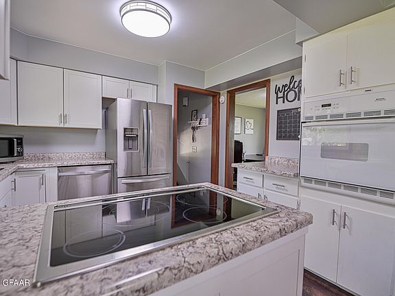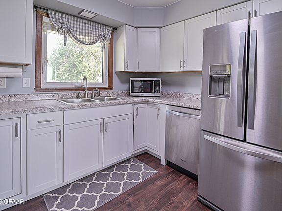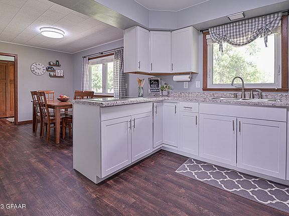 This 3 bed, 2 bath sits on 2 lots on the edge of Gilby creating a parklike setting! Kitchen newly remodeled & has eat-in dining & formal dining. Living room w/huge south facing windows & electric fireplace. Master suite w/ 3/4 att. bath. Spacious basement is unfinished allowing you to personalize the space to fit your needs & is plumbed for a bathroom. Other features include: steel siding, radon mitigation system, 3 garage stalls & apple trees.