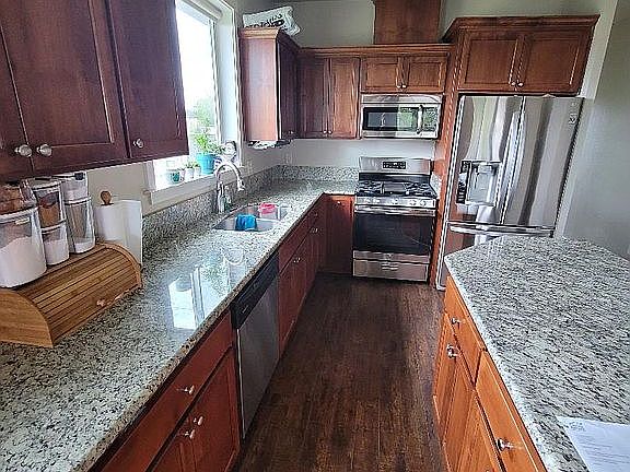 Home on corner w/ no neighbor behind you! Vaulted ceilings in living room & Primary suite. Open floor plan w/ granite counter tops, island, pantry & gas range. Stay cool in summer w/ your A/C & cozy in the winter w/ your gas fireplace. Dual sinks in primary suite & walk in closet. Relax on the extended covered patio. Fully fenced private backyard. Utility sink in laundry room & Oversized garage. Great location for commuting to Salem/Portland! Seller will contribute 5,000 to buyer's closing cost