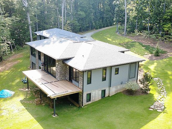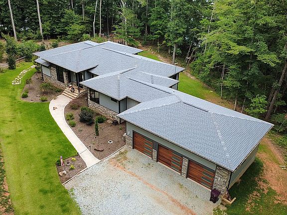 Custom modern minimalist home. Large open floor plan with glass and hardwoods everywhere. 12’ Ceilings and modern office, beautiful Great room and stone wall. 10’ Ceilings in Master suite, huge shower, private bidet, his/ hers vanities. Appropriate Master closet and windows. Three additional Bedrooms with either private full bathroom, or shared bath and nursery layout. Main floor Laundry next to garage and a winding hallway to quiet sounds coming into a well appointed kitchen with massive eat at island. Top line Bosch appliances. Basement will be partially finished (1,822 SF) with Summer room, full shower bath, large entertainment area with butler’s sink and fridge, second laundry room, indoor vented nursery, wet room, and a forth garage with roll-up. As well, a 38’ long room dedicated to storage. Outside is well landscaped, 10,000sf Zoysia lawn, path to lake through woods, kayak rack, fire-pit, fenced garden. Short path through Duke Energy barrier property leads to quiet point behind the home, and newly restored 24’ pontoon dock and floating ramp. Additions to exterior include hardscape rear patio with fire pit, retaining walls. Establish a walking path with mature landscape from driveway to rear patio area. Planting additional mature Green Giant Arborvitae alongside driveway. Finally, Asphalt paving of driveway from Anglers Cove Ct to a new concrete pad in front of the attached 3 car garage. 10’ minimum \ 12 foot ceilings main floor. 7,246 SF heated radiant floor system. 3,128 SF finished main floor 1,120 SF finished (3) car main garage 2,998 SF Heated basement; 1,822 SF (to be finished) lower level, with finished garage/ garden shop, second laundry, entertainment, summer room, full shower bathroom. Indoor grow nursery, and storage galore. NOTICE: Owners are licensed NC General Contractors, and Licensed NC Real Estate Brokers.