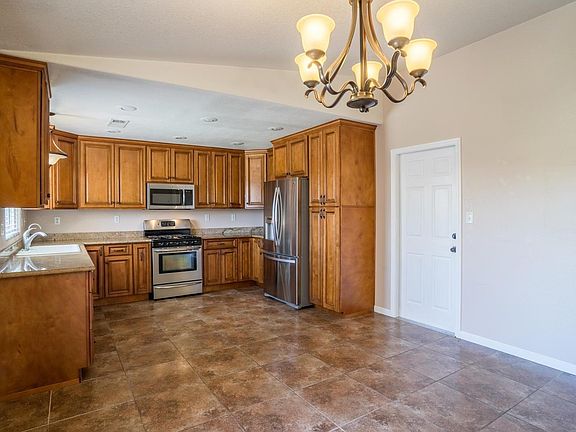 Beautiful Stallion Springs home with modeled kitchen. The home features 4 bedrooms 2 bathrooms with vaulted ceilings, cherry wood custom cabinets, granite counter tops, and stainless steel appliances.