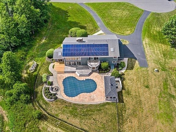 Privacy and Views that won't disappoint the most discerning buyer!! Traditional curb appeal with Impressive Soaring Open Great Room and Contemporary Styling, 3 sided Gas Fireplace, Wet Bar, Main open staircase plus Spiral staircase to Interior Balcony and bedroom quarters. Formal Dining Room, Den/Study with Built-ins and Slider to separate deck, Cooks dream kitchen with multiple cook surfaces, downdraft range hood, pantry, island plus separate full eating area & slider to teak deck. Many extras including Upper Deck and sliders, Wine cellar, Sauna, extra shelved storage room in lower level, computer area off back foyer, fire pit with wall seating, heated Pool & Cabana, 3 car garage, alarm system, near net electric energy from owned brand new solar system, brand new central air condensers (3), plus much more. Private showings only please.
