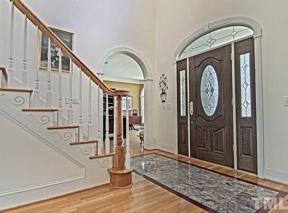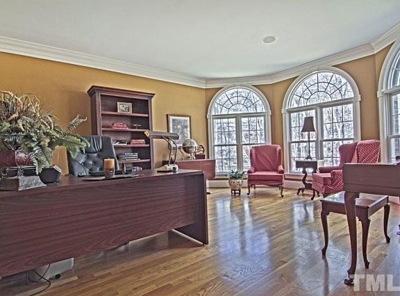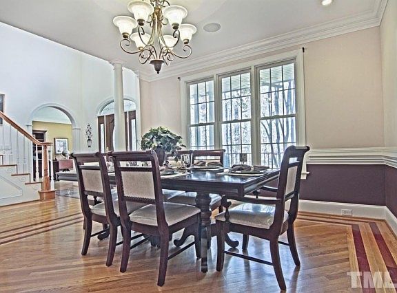 CUSTOM BUILT transitional features Gourmet Kitchen with Gran Counters, Raised panel cherry cabinets, Bosch DW, SS appls, butler pantry, Luxurious Master w/Spa & Sitting Area, 9' ceilings up & down, hardwoods & tile, tons of moulding, columns, spacious 2 story FR w/cath. ceils. Marble & Gran FP's, WI Pantry, WIC's, transoms, paladian windows, arched entries, central vac, Andersen windows & solid core doors throughout, 30'x50' walk up attic! Whole house H2O Filtr System. Mins to RTP, RDU & 540!