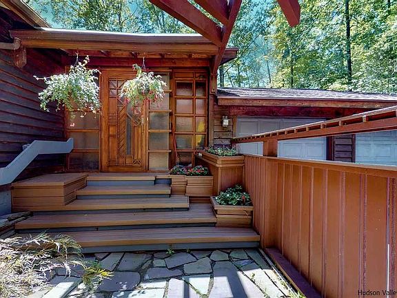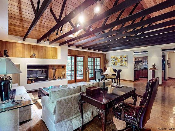 Whimsical woodwork flourishes by noted artist and architect Cary Cook accentuate the many positives of this modern Woodstock home on six-plus wooded, secluded acres. Through an anteroom enter an inviting living room with vaulted ceilings, exposed beams, skylights, fireplace and french doors that open to a south-facing outdoor deck. Flow into the gourmet kitchen with custom California Cabinets, Sub-Zero appliances, imported Carinthian marble countertops and pounded copper sinks--with mother-of-pearl stoppers! The upstairs master bedroom suite is replete with its own sitting room and more marble and copper in its en suite bath. Two additional bedrooms and a full bath complete this level. Step down to a half level consisting of a four season atrium and a game room with access to the attached two car garage. Down another half flight of stairs discover a whole world unto it self! Start with a windowed, walkout basement room with a state-of-the-art home theater! Stacked McIntosh components and surround sound speakers were recently updated and convey with the property. Travel down a hallway laid out with art gallery wall spaces to a downstairs bedroom, drawing room and a marble bathroom--that itself could be considered a luxury apartment! This level could act as act as its own suite, the only danger being you may never want to leave! Form meets function in this amazing home, with meticulously maintained mechanicals and a Winco whole house generator for uninterrupted electrical service no matter what. A separate structure with heat and electric could serve as an office, a yoga/workout/meditation room, an artist's studio or a writer's sanctuary. Near total quiet and seclusion yet convenient to Woodstock and all the Catskills and Hudson Valley have to offer. Tennis anyone? Walk through the woods on your own wood chip path and join the nearby Black Acre Tennis Club!