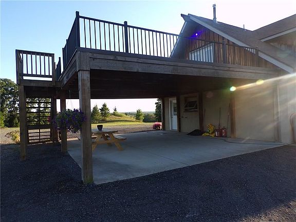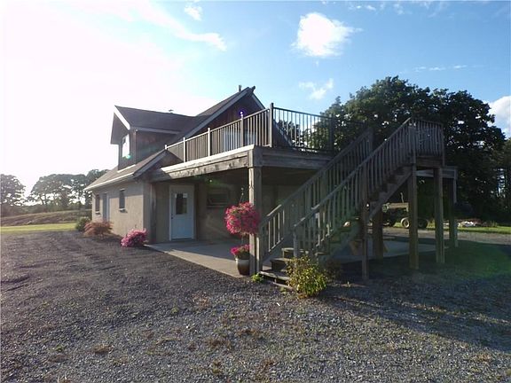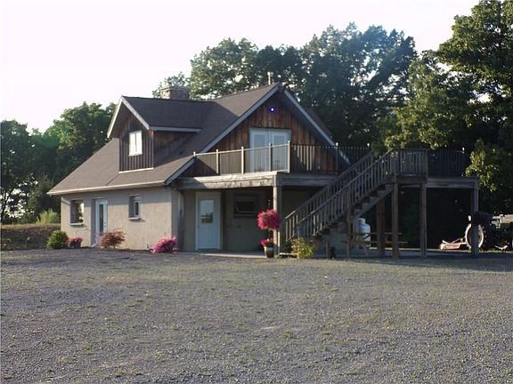 Private Hill Top home with Tri-County views overlooking scenic 11+ acre lot with spring fed pond & long driveway & picturesque views. This home was hand crafted with the finest of materials in construction featuring black walnut cabinetry, solid birch doors and walnut flooring. Covered 24x26' patio can serve as a carport or entertaining area. Open kitchen with counter top seating flowing into living room area with cathedral ceiling, floor to ceiling stone fireplace and stone wall with plenty of windows. 1st flr bedroom with full bath, laundry room & half bath make this convenient living. Second floor features Master large bedroom with 2-walk-in closets, full bath and bonus room that could be dressing room or possible 3rd bedroom....french doors leading out to upper patio with steel newer railings with walk down to ground level. Spring fed pond on site and more....roof=1 yr. old, AC split unit=recent. Qualified Buyers Only.
