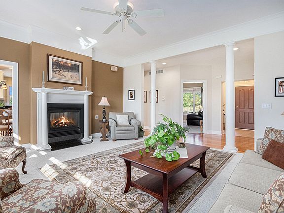This spacious 3-4 bedroom, 4 full bathroom home in the sought-after Longmeadow neighborhood. As you step inside, you'll be captivated by stunning views of the pond from nearly every room. The beautiful kitchen, featuring solid surface countertops, is complemented by a main-level primary suite with an attached bath, and a conveniently located laundry room with extra office space. A separate primary office offers the ideal setup for working from home. The cozy living area, enhanced by a two-sided gas fireplace, creates a perfect atmosphere for relaxing evenings, and can also be enjoyed from the eat-in dining area.