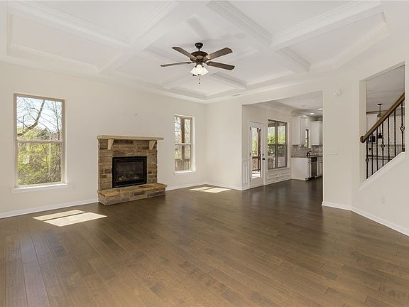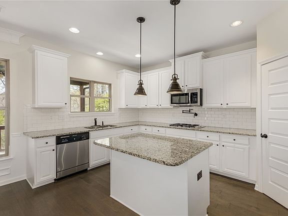 Move-in ready Rivendell basement home with 7 bedrooms and 5 full baths on a cul-de-sac lot with fenced yard backing to a small creek. Fresh neutral paint and new carpet throughout. Entering the home from the rocking chair front porch, a formal dining room and office with french doors greet you on either side of the foyer. Engineered hardwoods flow throughout the main living spaces on the main floor. A spacious living room features a stone fireplace with gas logs. Just beyond the living room is the breakfast room and large kitchen. The kitchen features an abundance of white cabinetry, granite countertops, double oven, gas cooktop with pot filler, center island, window overlooking the backyard, and a spacious pantry with built-in shelving. From the breakfast area, access the massive back deck that overlooks the backyard. The main level also features an en-suite bedroom, perfect for guests. Upstairs you will find a huge flex room as well as a separate loft area. Two bedrooms upstairs share a Jack and Jill bath. A third upstairs bedroom is an en-suite. The primary suite is oversized and features vaulted ceilings, a bathroom with double sink vanity, large tub, separate tiled shower, and a massive walk-in closet with built-in shelving. The laundry room with storage cabinets is conveniently located beside the primary bedroom. Do not miss the additional space in the finished walk-out basement. Here you will find two additional bedrooms, a full bath, a large rec space, and a spacious unfinished storage room with shelving. The basement rec room has rough plumbing for a wet bar. Through the backdoor in the basement, access the backyard with patio. The backyard is fully fenced and has no direct backyard neighbor. A wooded creek area creates a quiet buffer at the back of the property. Rivendell amenities include clubhouse, fitness center, pool, and playground.