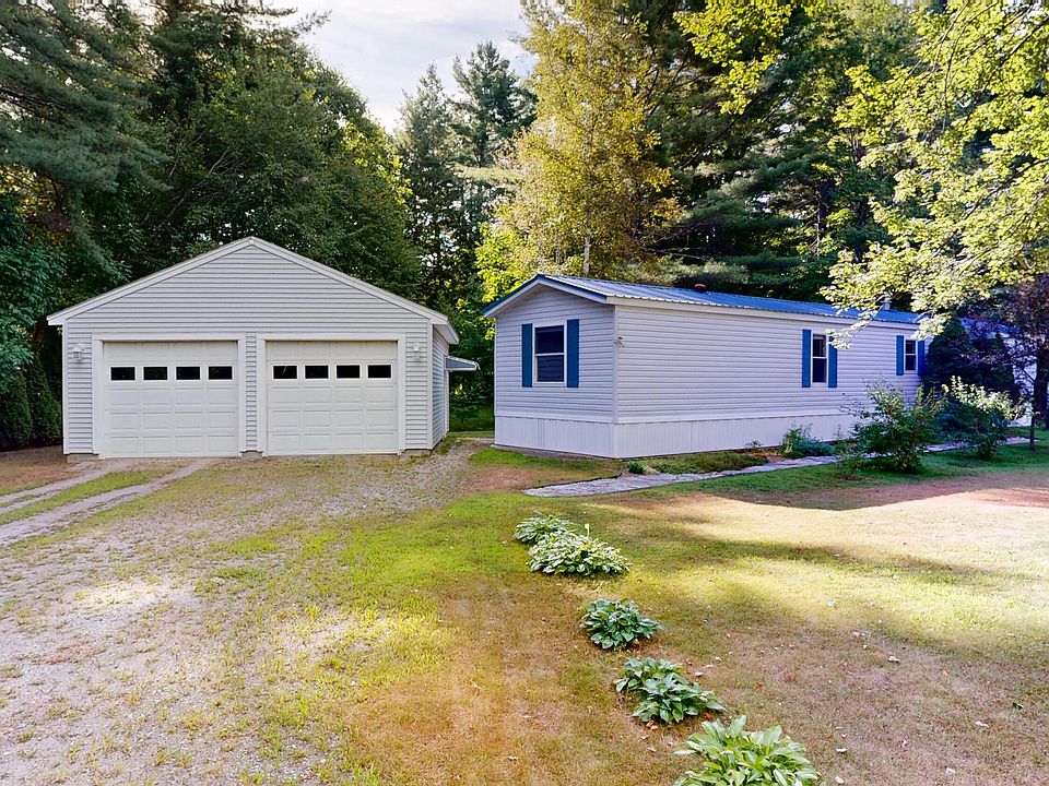 Discover low-maintenance, affordable living on this beautiful 1.2-acre lot in Poland. This 2-bedroom, 1.5-bath mobile home offers a metal roof, a detached 2-car garage, and a large wood shed for extra storage. The property is full of natural beauty, featuring twisted willows, raspberry and blueberry bushes, 2 peach trees, a native hazelnut tree, and a lovely rock wall that surrounds the grounds. A small frog pond adds to the charm (thriving in a normal rainfall year.) Outdoor enthusiasts will appreciate the direct access to snowmobile trails across the road, and being just minutes away from Middle and Upper Range Ponds, complete with a public boat launch. The setting is peaceful and rural, next to farmland, yet conveniently located only 20 minutes from Lewiston/Auburn and 30 minutes from Portland. If you're looking for an affordable country lifestyle with natural beauty and easy access to recreation, this property is a must-see!