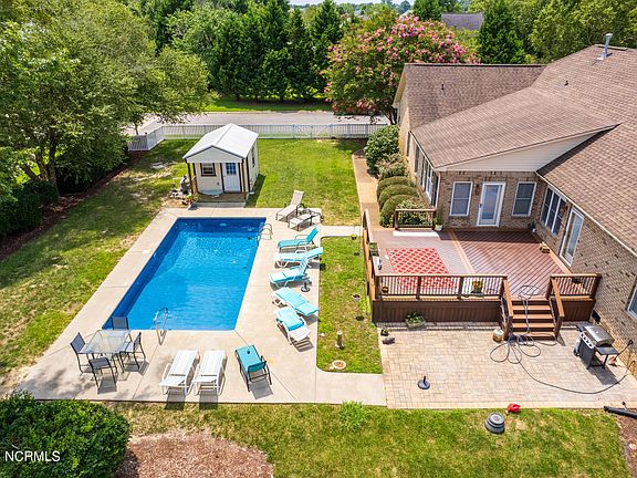Welcome to this elegant, lovingly maintained brick ranch! One level living awaits. This home features 3 bedrooms plus a large unfinished room over the 2.5 car garage, as well as an in-ground saltwater pool! The chef's kitchen features granite counters, upgraded stainless appliances, a gas range, double oven, and a wet bar! The primary en-suite features 2 large walk-in closets, large bathroom with double vanities, toilet room with storage, as well as a tub, and shower. The home also features a tankless water heater, central vacuum, shed with electric, crawl space with vapor barrier and dehumidifier, and city sewer! No flood insurance required AND the potential to assume the seller's VA loan at a 2.75% interest rate.